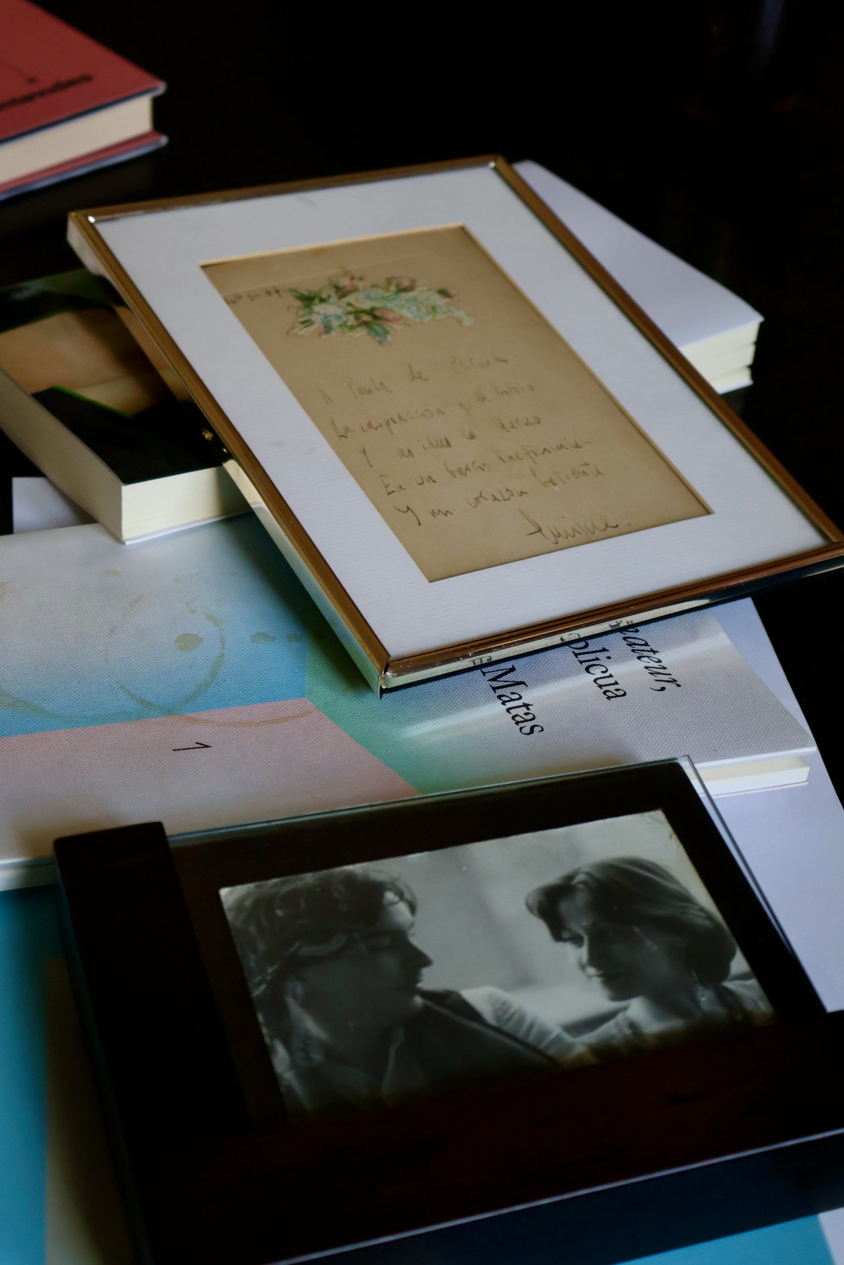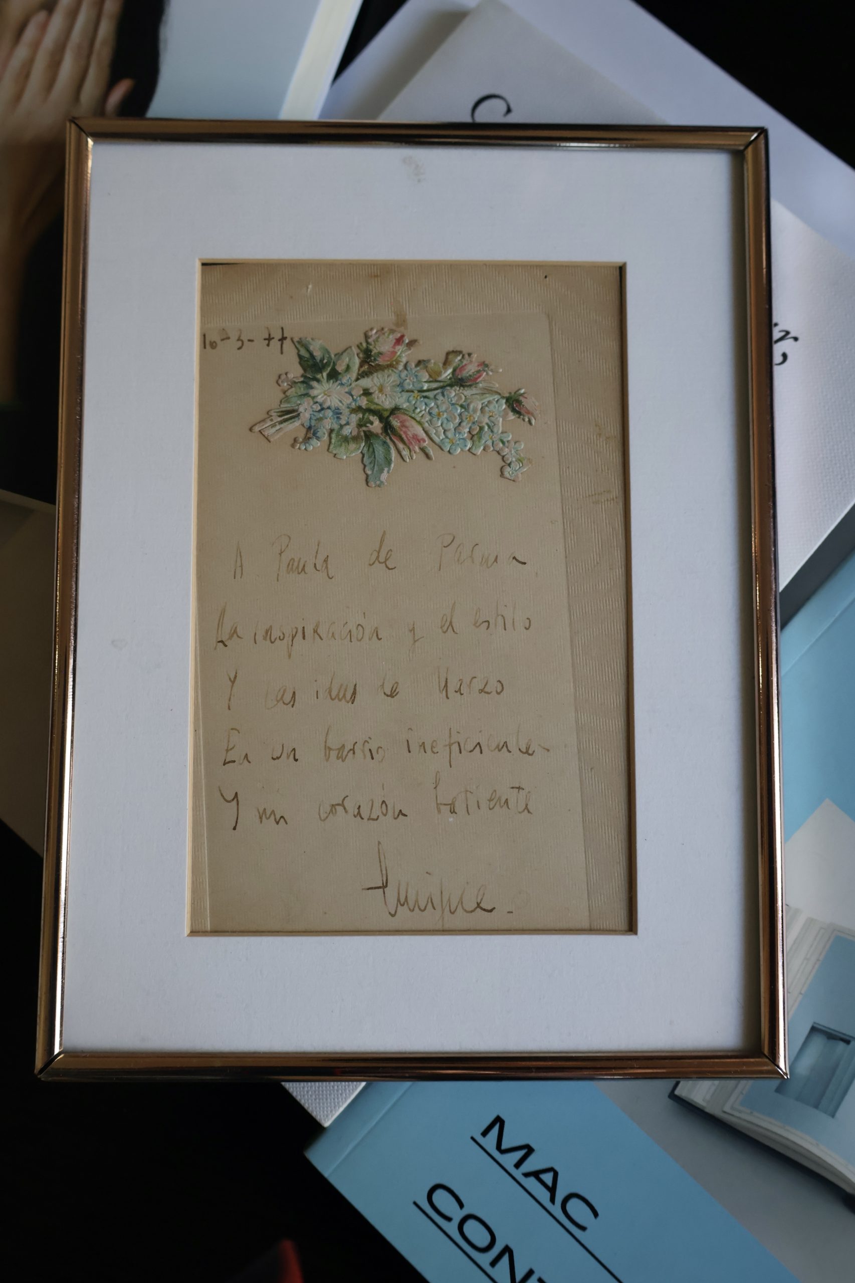 —De un pequeño juego de palabras: ella es de Palma y el nombre se parece a Parma. Viene del día de marzo de 1977 en que, muy poco después de conocernos, fuimos a comer a un restaurante de la Boquería. (Desde la butaca en la que está sentado, me señala un marco en el que hay una pequeña hoja con una anotación). Quise impresionarla y mira, le escribí: “A Paula de Parma, la inspiración y el estilo y los idus de marzo en un barrio ineficiente y un corazón latiente”. Un pastiche, montado con expresiones de Juan Benet y de Gil de Biedma y con el nombre de una ciudad italiana, que es lo que ha sobrevivido de aquel texto fundacional del que surgió un nombre que estaría, a partir de entonces, en todas las dedicatorias.
