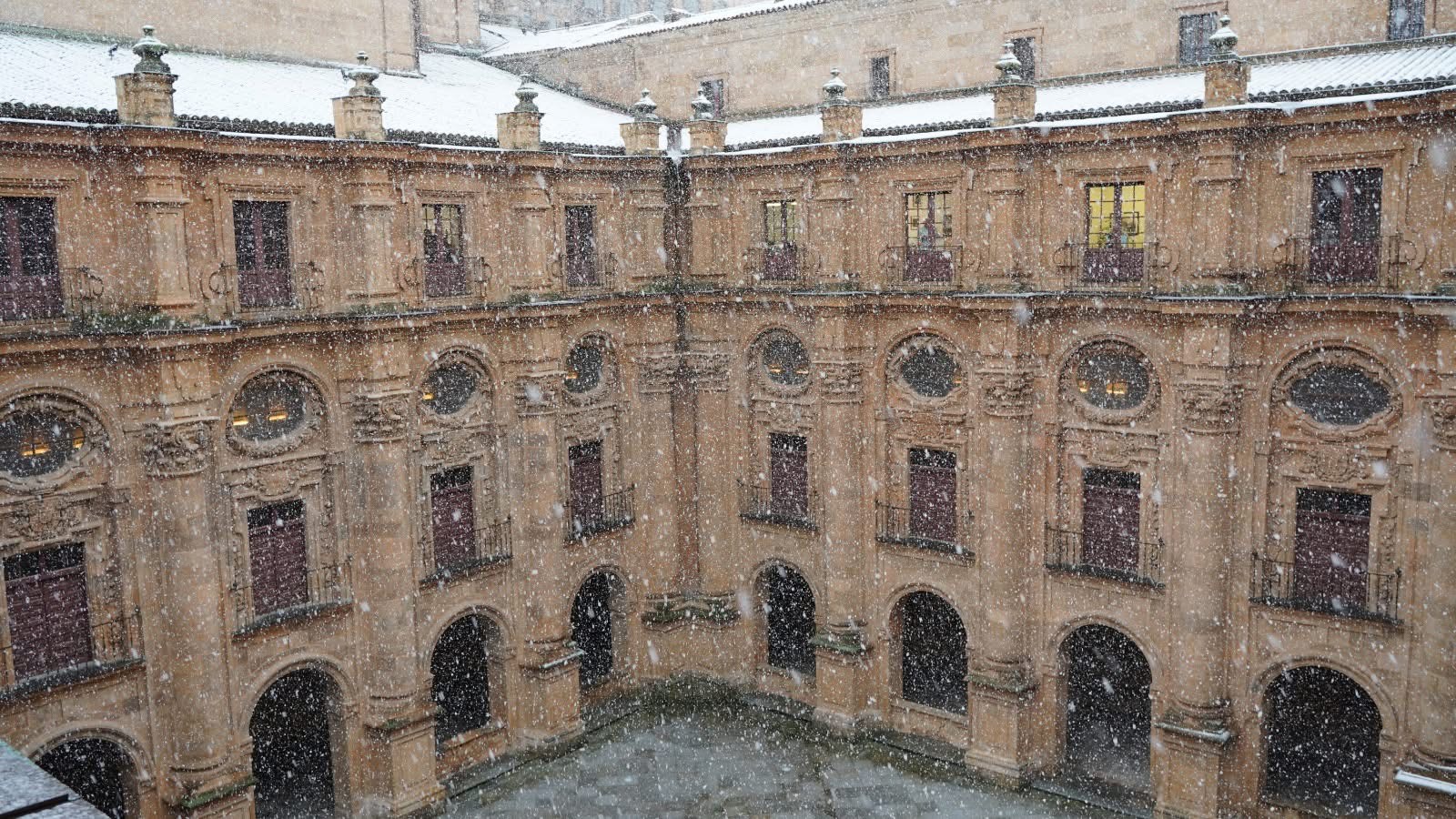 Pero también es la nieve memoria, y al cabo todas las nevadas son la misma porque comportan una suerte de armisticio en el fragor de la cotidianidad, y por eso cada una de ellas se conecta irremediablemente con las anteriores hasta fundirse en una única estampa. Veía nevar en Madrid y mientras observaba los rascacielos ateridos contemplaba también el valle de mi infancia en aquellas mañanas en las que uno se despertaba y subía la persiana y descubría las montañas nuestras de cada día cubiertas por una sábana blanca que convertía el mundo entero en una postal por estrenar. Y vi igualmente la nieve modificando el paisaje de Busdongo, sus casas medio aisladas y su estación más solitaria que nunca allá en lo alto, en aquella mañana de sol frío en la que quisimos que descubriera Elnita el milagro del invierno. Pero también veía el claustro de la Clerecía, en aquel otro enero en que nos sorprendió la nieve en plenas clases y, como si hubiésemos decidido rubricar en silencio un pacto que nadie formuló pero que todos asumimos, abandonamos la facultad todos a una para extraviarnos por aquellas calles de oro y plateresco a dejarnos llevar por el invierno, conscientes de que nunca estuvo ni podría estar Salamanca más bonita.
