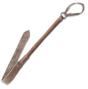 Rebenque como el que el Cuervo utilizaba para golpear a Sancho y sus compañeros galeotes. La tira de cuero del extremo contrario a la argolla era lo que impactaba en la espalda, con un chasquido muy seco y muy doloroso. En ocasiones el cómitre utilizaba el mango para añadir dolor