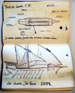 Planta de galera del S XVI y silueta de la San Telmo dibujada por el autor en su libreta de anotaciones