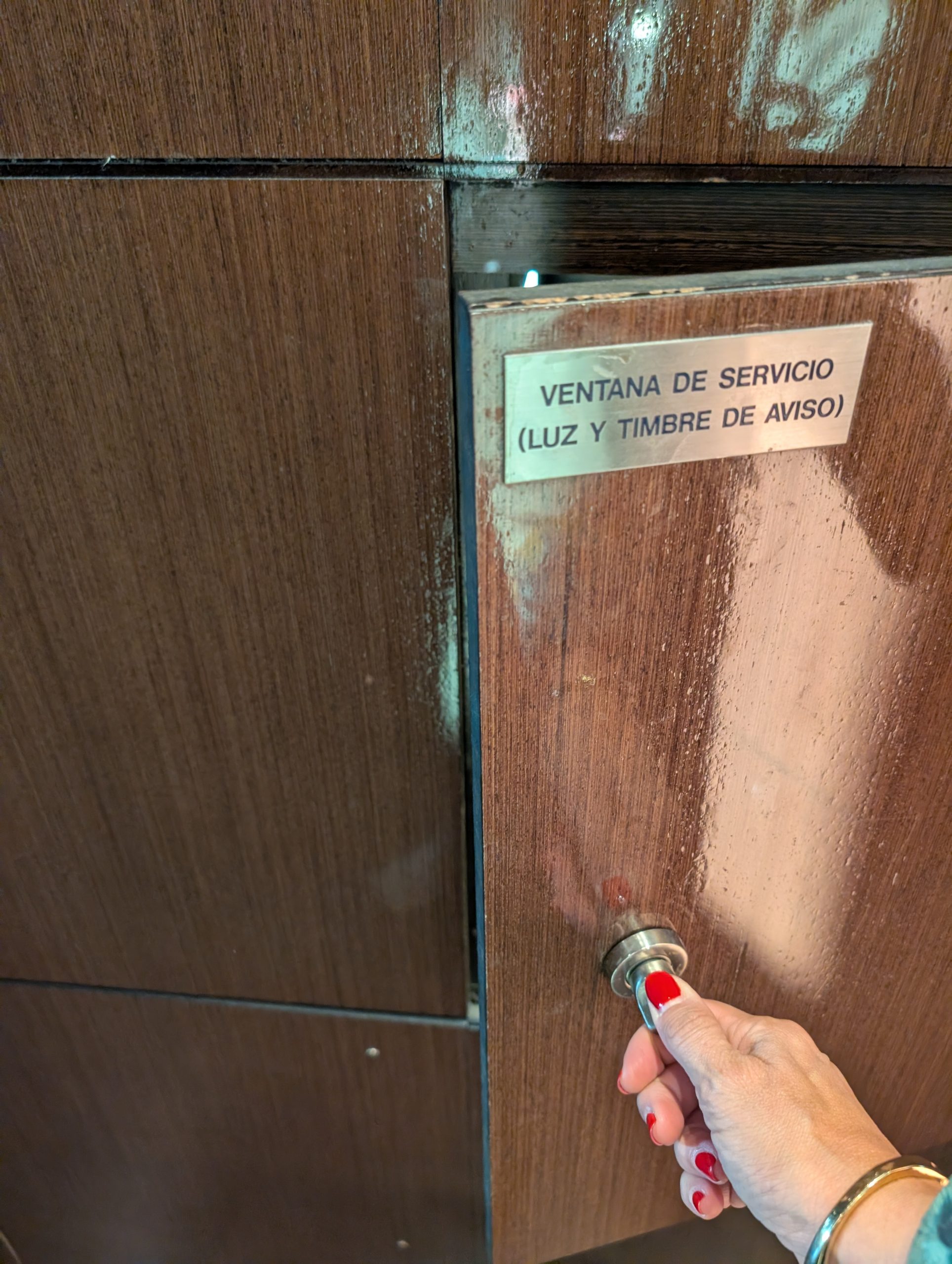 Sin embargo, lo mejor no era el catálogo. Lo mejor era el sistema de entrega. Uno llamaba desde el teléfono de la habitación y los productos ascendían discretamente por un pequeño montacargas oculto tras una puertecita de madera. Esos mini ascensores domésticos que en inglés llaman dumbwaiters, y que aquí, en su versión castiza, se convierten en cómplices mudos del entusiasmo humano. En la pared, una placa metálica sobria: VENTANA DE SERVICIO (LUZ Y TIMBRE DE AVISO).