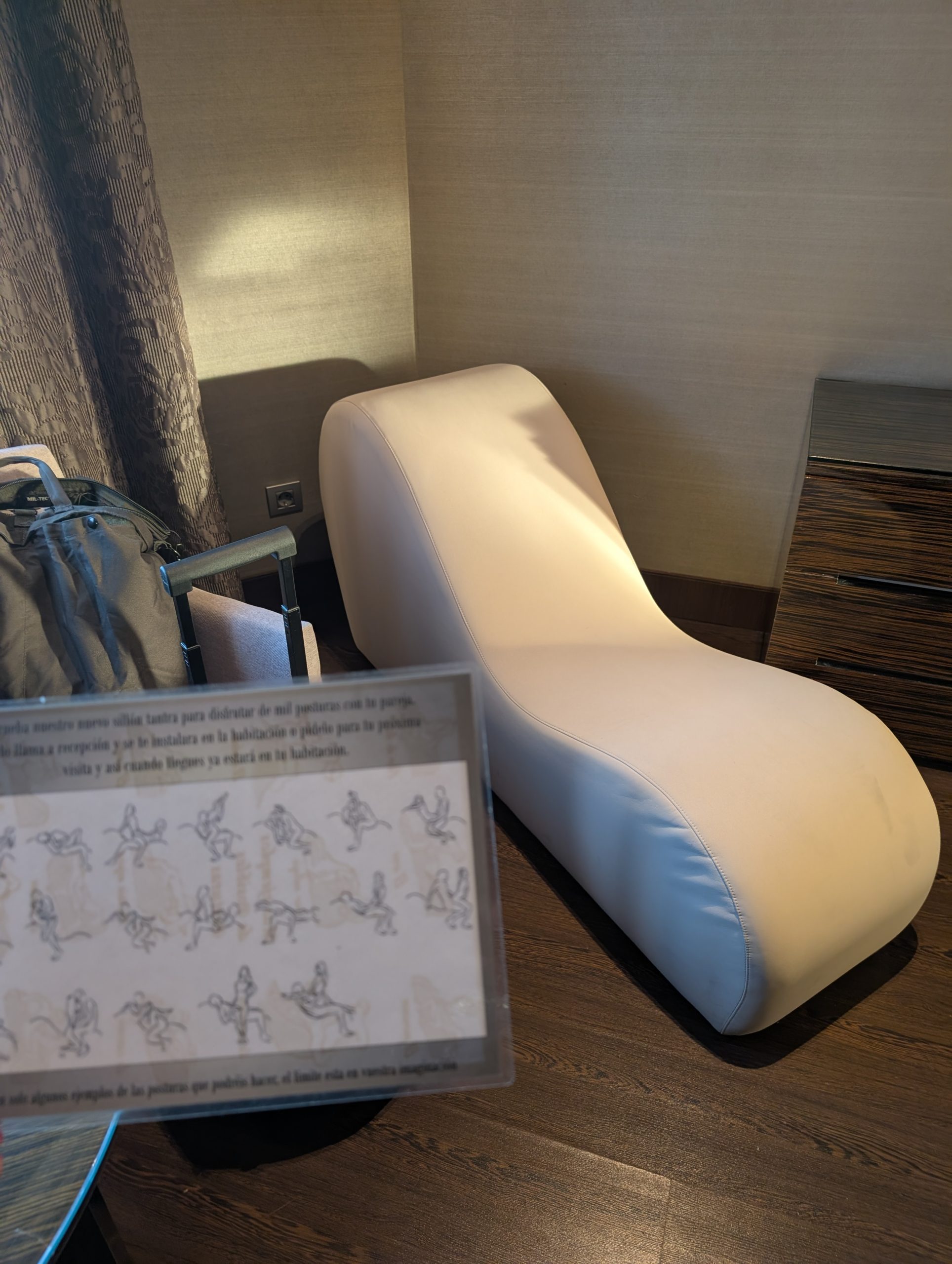 Hasta que lo vi. El sillón. Aunque no era exactamente un sillón. Tampoco un sofá. Ni una chaise longue convencional. Era una especie de ola blanca de escay, con curvas estratégicas, que parecía diseñada por un arquitecto con sentido del humor y mala intención. Al principio pensé que era una excentricidad de diseño, una licencia contemporánea para romper la monotonía del hotel. Lo miré un rato sin entender. Hasta que encontré las instrucciones. Plastificadas. En la mesita de noche.