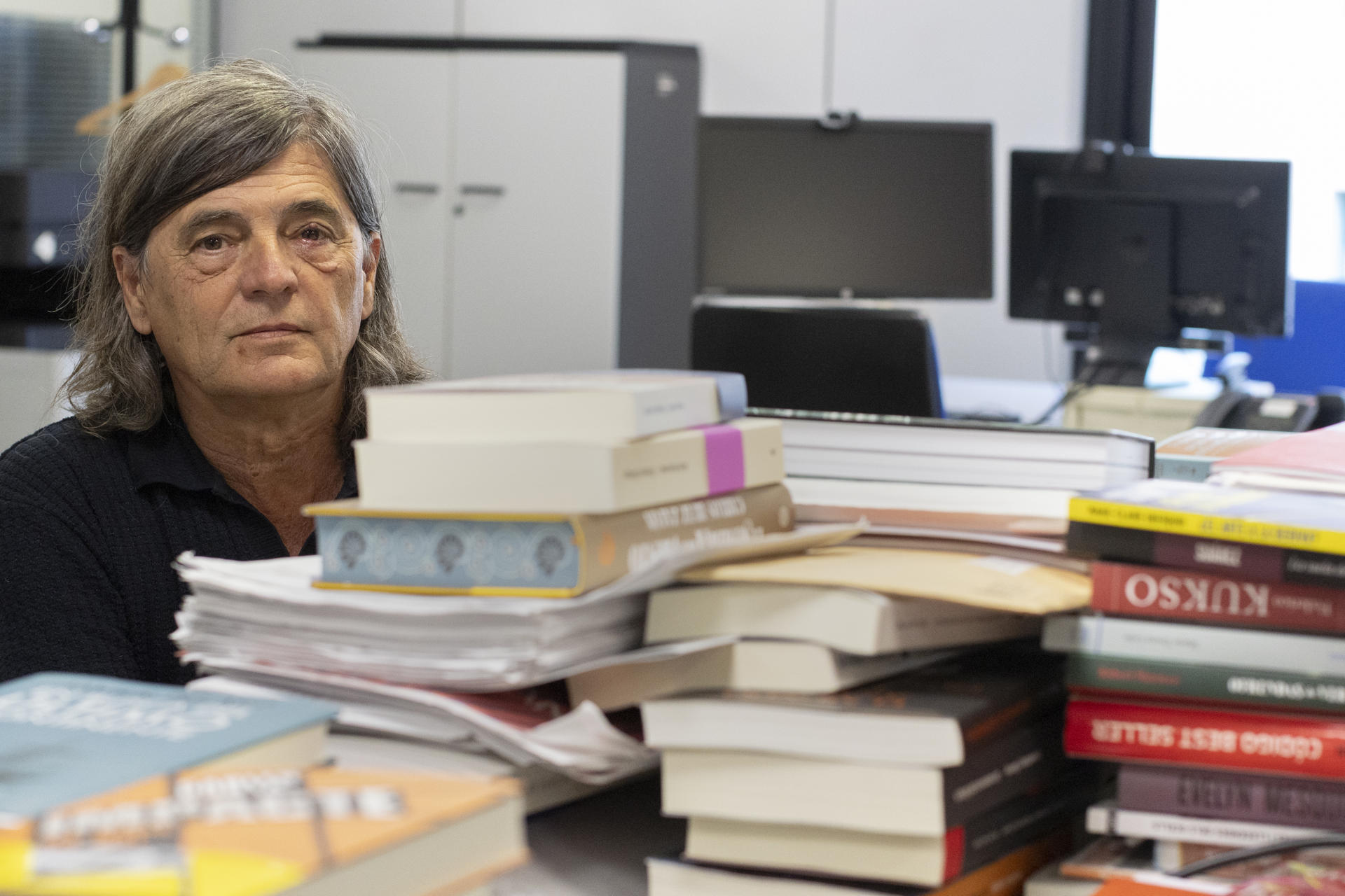 Como buen periodista cultural, su mesa de trabajo es algo así como un fuerte construido por montañas de libros que le “protegen” pero también lo proveen de herramientas para salir “ahí fuera” bien armado con lo aprendido y disfrutado. El periodista reconoce que los libros también forman barricadas en su casa, donde vive “amenazado” por no hacer limpieza de un arsenal de lectura que incluso ha empezado a esconder en los armarios de los hijos que ya se fueron de casa. “Intento ganar tiempo, muevo libros de aquí para allá”, reconoce sobre sus “trampas” para no enfrentarse a la limpia de ejemplares que impone la finitud del espacio físico.