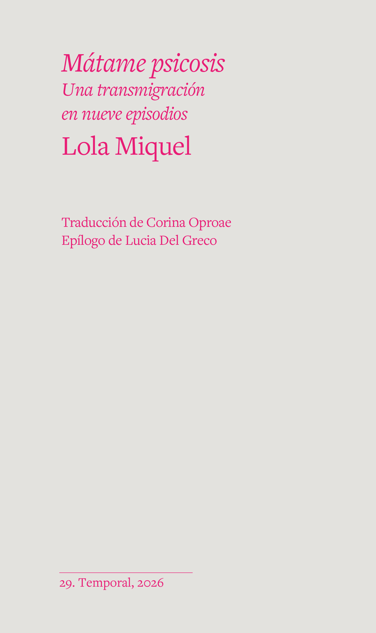 Dolors Miquel es una poeta nacida en Lleida en 1960. Es una de las voces poéticas más reconocidas de la literatura contemporánea en catalán y ha sido galardonada con diversos reconocimientos, como el Premio Ciutat de Barcelona de Poesia (2005) o el Premio Alfons el Magnànim de Poesia (2011 y 2012). Presentamos una muestra de Mátame psicosis, uno de los textos más aclamados de la autora, que gracias a Temporal Casa Editora, se traduce por primera vez al castellano de la mano de Corina Oproae y será publicado en marzo de 2026. Además, viene acompañado de un epílogo de Lucia Del Greco, quien dirigió su puesta en escena en Barcelona en 2025, cuando se estrenó en la Fundació Joan Brossa, con dramaturgia de Albert Roig y con Alba Pujol como protagonista. Es un texto híbrido en el que la autora hace de la transformación un ejercicio poético en el que reflexiona sobre qué espacio le quedan a la ternura y al amor en un mundo donde la catástrofe y el terror están a la orden del día. Mediante una voz que se va transformando según pasan las páginas, y cuyo discurso solo se interrumpe por el aluvión de noticias que van llegando desde el exterior, la autora reflexiona sobre cómo pensar nuestra identidad en un mundo marcado por la violencia.
