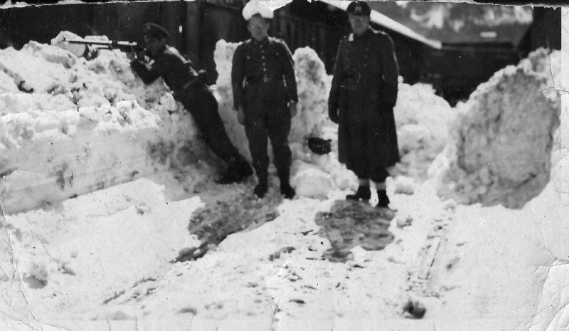 Guardia civil Antonio Benedé apuntando con su fusil junto a dos soldados alemanes en la estación de Canfranc (foto cedida por la familia Benedé, copyright Mira editores)